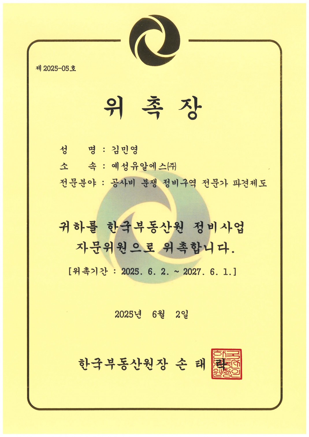 한국부동산원 정비사업 자문위원 위촉장 > 등록증/인증서
